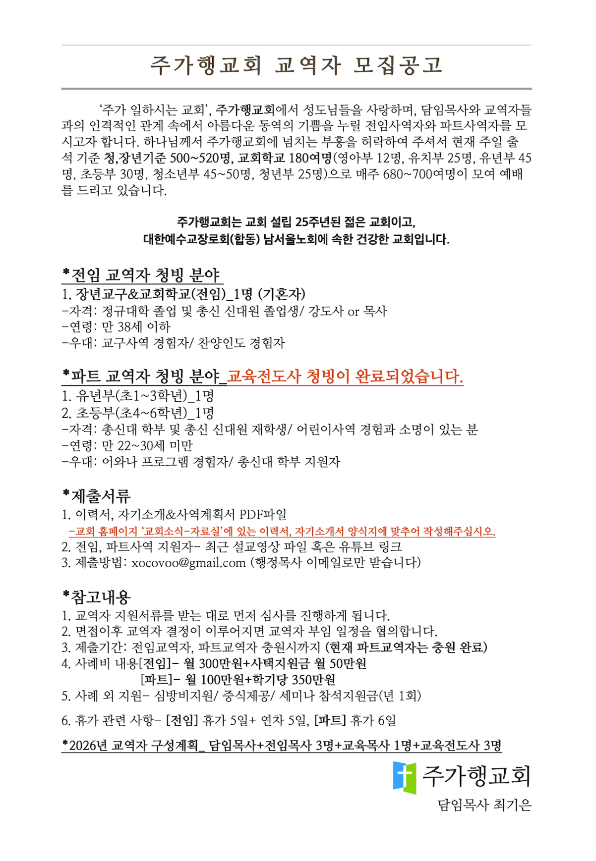 주가행교회에서 함께 할 전임교역자를 모십니다.