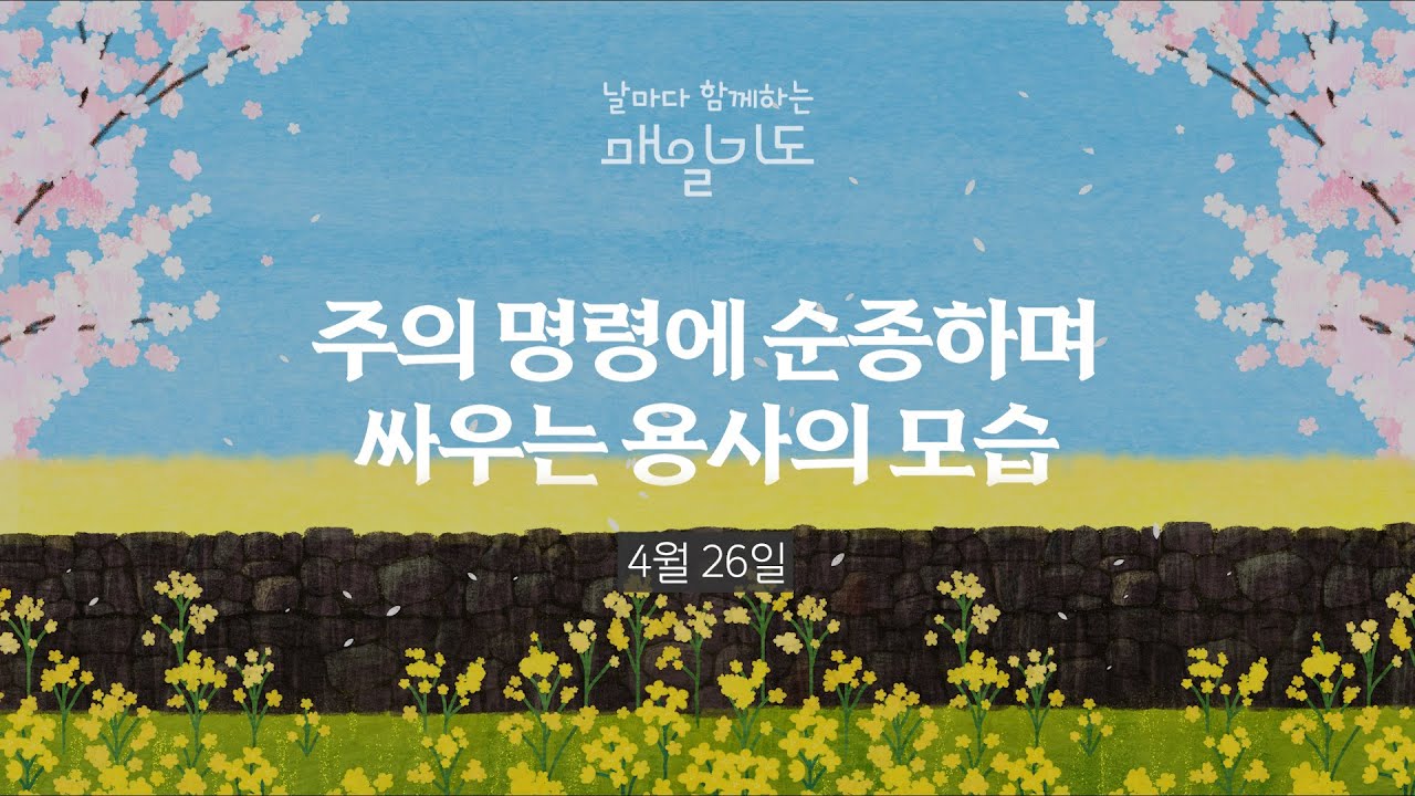 [매일기도] 4월 26일 토요일 | 주의 명령에 순종하며 싸우는 용사의 모습 기독정보닷컴 2025.04.26 05:00 우리 주 예수 그리스도로 말미암아 우리에게 승리를 주시는 하나님께 감사하노니 (고린도전서 15장 57절) 승리의 하나님 아버지! 0