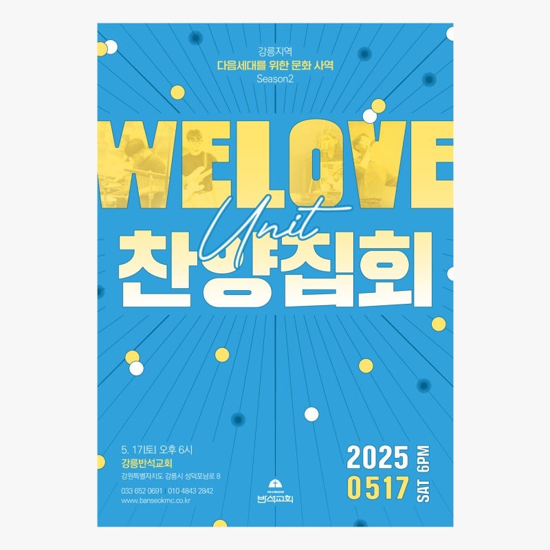 샘플 번호 01285 안녕하세요 나음과이음입니다.☺️ 강릉반석교회 다음세대 문화사역 찬양집회 포스터 디자인 소개해 드리려 합니다. 다음세대를 위한 찬양 집회에 걸맞게 밝고 청량한 에너지와 청년 세대의 연대감을 시각적으로 보여질 수 있게 디자인했습니다. ☀️ 디자인 컨셉 블루와 옐로우의 조합은 밝고 경쾌한 에너지를 전해주죠. 블루는 청량함과 믿음을, 옐로우는 생동감과 열정을 상징해 찬양 집회의 활기와 젊은 세대의 에너지를 담아낸 포스터가 완성되었습니다! ☀️ 타이포그래피 상단 WELOVE 텍스트 편집과 Unit, 찬양집회 텍스트의 서체를 무게감과 시각적 위계를 고려해 볼드체로 임팩트를 주면서 조화롭게 배치되도록 설.......