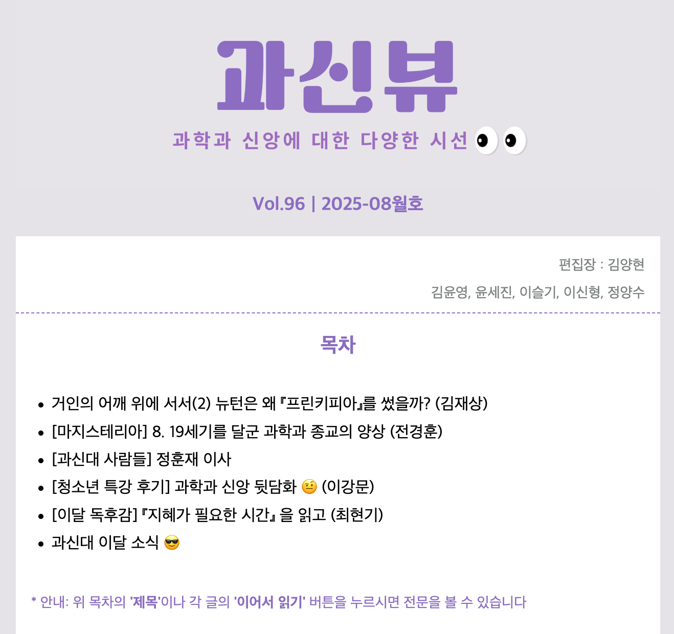 위 이미지를 클릭하시면 스티비 페이지로 이달 호를 볼 수 있습니다.기사 전문은 홈페이지에서 볼 수 있습니다. 목차거인의 어깨 위에 서서(2) 뉴턴은 왜 『프린키피아』를 썼을까? …