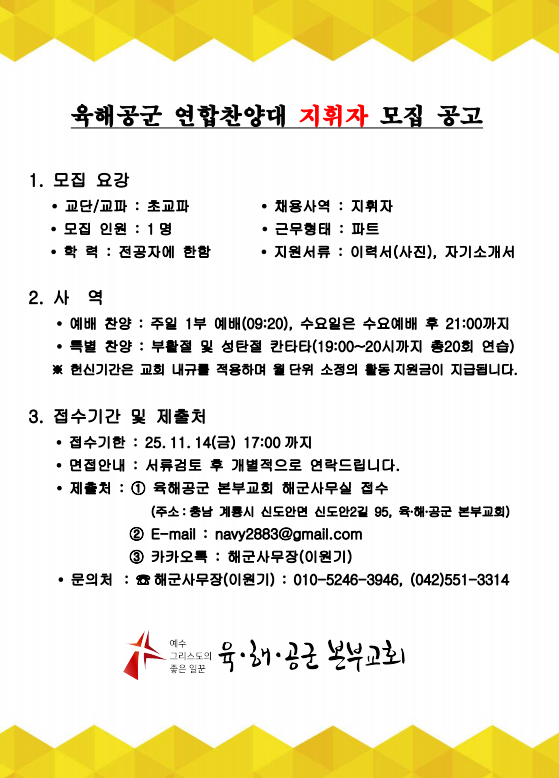 육해공군본부교회 지휘자 모집공고