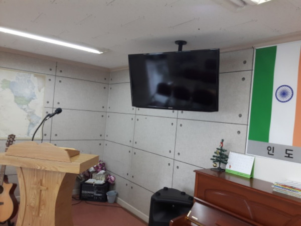 강대상,마이크 3개, 앰프, 스피커, 예배용 모니터, 소형 테이블2개, 원형 테이블, 의자, 벽걸이 에어컨, 케리어 에어로 18단 냉/난방기
