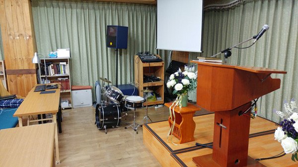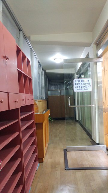 대구시 시지까지 십분도 안되는 경산시 백천동 부영초록마을아파트 상가 3층 / 60평 1000만 전세금 월 40만원 / 성구완비 시설비 절충 / 암진단 받고 급격한 건강 이상 올 수 있다는 의사 소견에 목회 접음 / 성도들은 남든지 원하는 곳으로 가라고 했음 / 사진은 뒤에서 앞에서 목양실과 입구 및 주방임