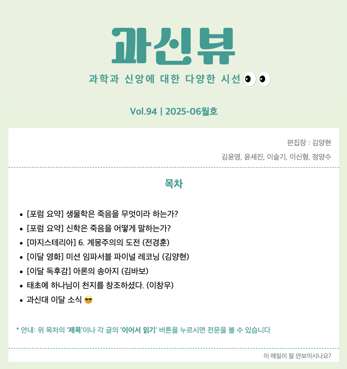 위 이미지를 클릭하시면 스티비 페이지로 이달 호를 볼 수 있습니다.기사 전문은 홈페이지에서 볼 수 있습니다. 목차[과신Q] 유신 VS 무신 - 신의 창조인가, 아닌가? (우종…